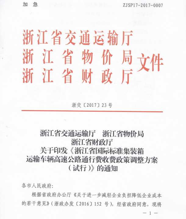 浙江省國(guó)際標(biāo)準(zhǔn)集裝箱運(yùn)輸車輛高速公路通行費(fèi)收費(fèi)政策調(diào)整方案(試行) 浙交[2017]23號(hào)