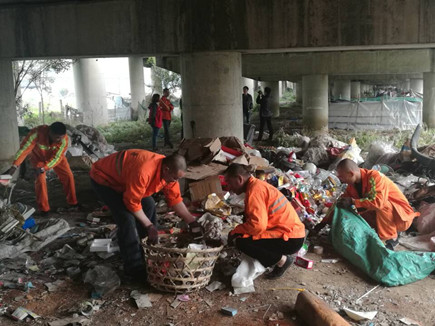 圖為養(yǎng)護(hù)公司人員清理橋下雜亂堆積物