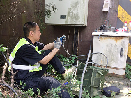 當天一早,中心隊員帶上相應的工具和設備直奔現場,在確認電纜位置及走向后,便著手抽離洞內電纜。考慮到洞口到配電箱電纜至少有100余米,電纜溝下面又鋪有其他眾多電纜以及之前掉落的垃圾,直接從洞口抽離根本無法動彈。于是,中心4名隊員便每隔10米左右用撬棍撬開上面水泥蓋板,整個人跳進電纜溝內,彎著腰一段一段抽離。抽到最后一個溝時,4人頂著烈日,齊力把重達近百斤電纜抽離整個電纜溝并放置在護欄內側草地上,隨后再從抽出的這段電纜中剪取適當長度,重新鋪設后與寧向出洞口的情報板電纜相接。