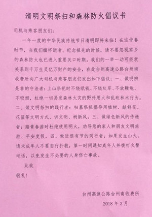 圖為倡議書 為增強防火意識,做到文明祭掃,3月16日上午,臺州南收費所在向過往司乘人員發(fā)放《清明文明祭掃和森林防火倡議書》,倡議大家做明辨是非的守法者:不燒紙錢、不放鞭炮、杜絕野外用火和亂伐林木行為;做文明祭掃的踐行者:提倡用植樹、獻鮮花、花籃等方式祭祖;做綠色新風的傳遞者:勸導家人和朋友文明出游;做進退有節(jié)的同行者:發(fā)生山火,理智救火。