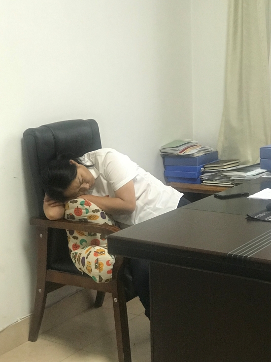 圖為行政人一夜未眠稍作休息