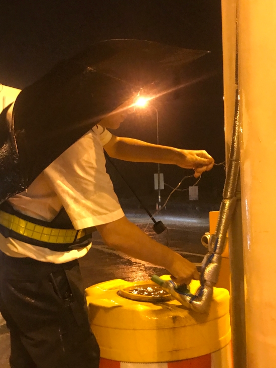 8月9日21點22分,風(fēng)雨越來越大,臨海南收費所車道水管被狂風(fēng)吹得隨意搖晃,當(dāng)班收費員李俊杰不顧狂風(fēng)暴雨,第一時間拿上鐵絲冒雨捆綁,防止砸到過往車輛,保證了車道安全暢通。