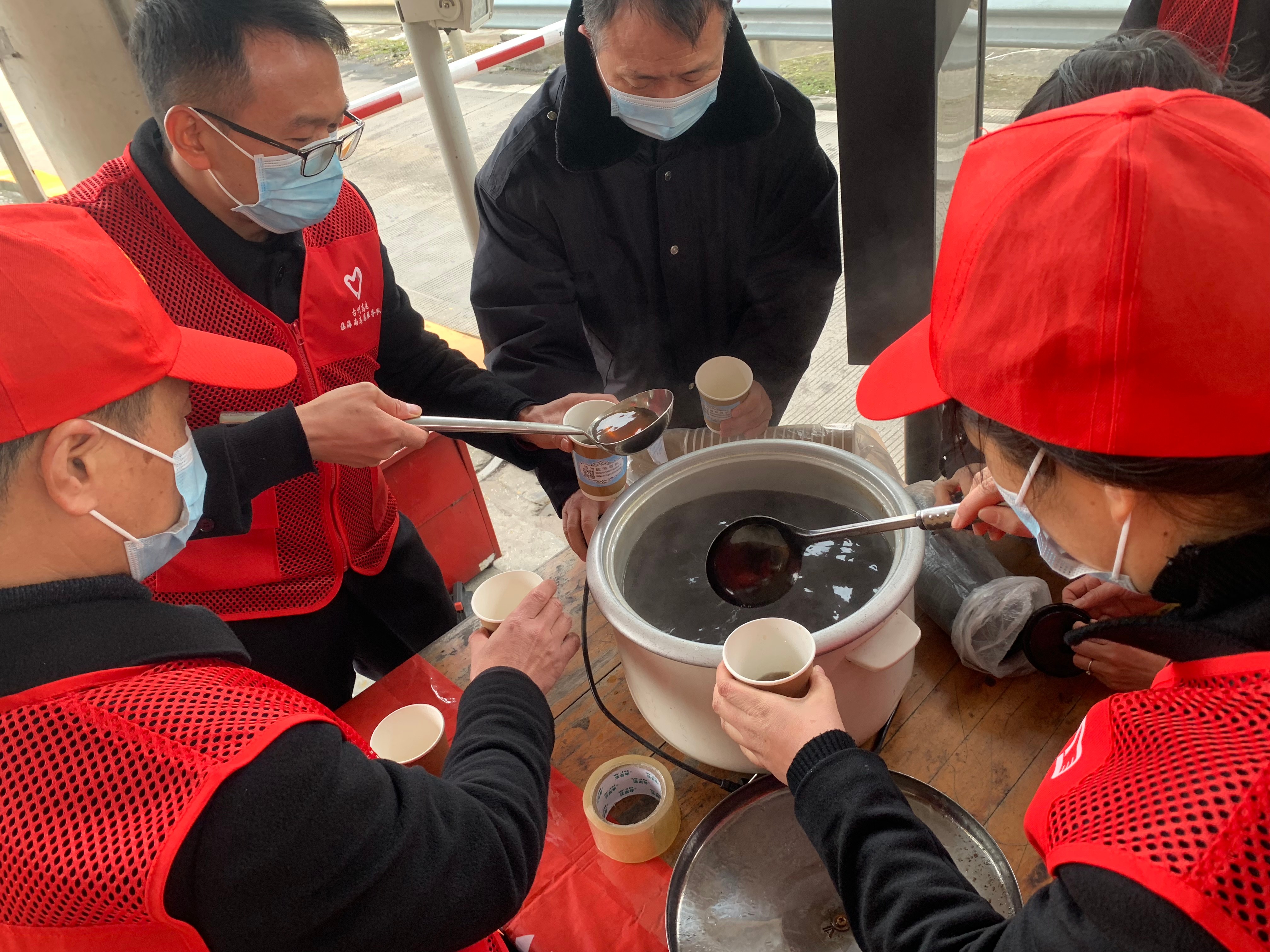 當天上午,收費所食堂預先熬制好滿滿一大鍋紅棗姜茶,伴隨著鵝毛大雪,車道寒風凜冽,但刺骨的寒風擋不住志愿者們的似火熱情,大家身穿紅馬甲,面帶口罩,在搭好志愿服務臺后,有的負責用勺子把滾燙的茶水裝進紙杯,有的負責蓋杯蓋,有的負責傳遞,有的負責把裝好茶水的杯子送給駕駛員,現(xiàn)場有序分工。熱情的服務贏得過往司乘人員的好評。