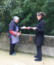 圖為女職工向當(dāng)?shù)乩先诵麄髑迕魑拿骷罀?/span>