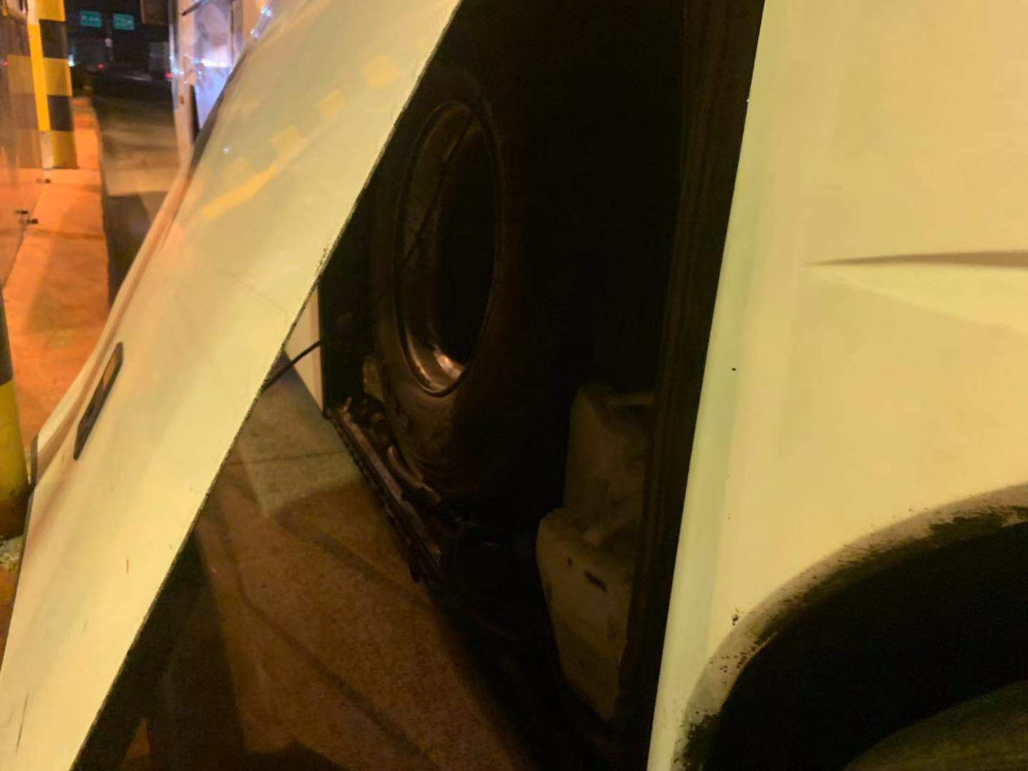 圖為被物品擠開的客車側(cè)門 此次事故由于客車車箱內(nèi)放置過多的物品,在車箱門邊上還硬塞了幾只大輪胎,最終導(dǎo)致輪胎將側(cè)門擠開而沒被司機發(fā)現(xiàn),在高速過ETC車道時箱門撞到了設(shè)備,司機對此也是后悔不已。 近期,收費站發(fā)生過不少同類事件,有司機通過ETC車道時因車速過快未感應(yīng)到線圈,擋風玻璃撞到欄桿;有集裝箱后門沒關(guān)撞到ETC設(shè)備。在此提醒過往司乘行車前務(wù)必要檢查好車輛安全情況,過ETC車道需要慢行。如果在高速上出現(xiàn)突發(fā)情況也不要慌張,及時向工作人員或者撥打求助電話請求幫助。 楊相暖