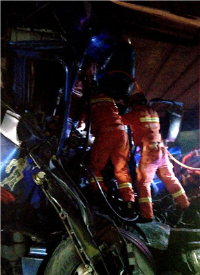 5分鐘后,兩輛紅藍警燈閃爍的施救車迅速飛至現(xiàn)場。此時現(xiàn)場多車損毀嚴重,尤其最后一輛大貨車駕駛室嚴重變形,司機受傷,胸部以下被車頭卡住無法動彈,血水從門縫流出,現(xiàn)有設備無法有效救援,也無法知道有無生命危險。