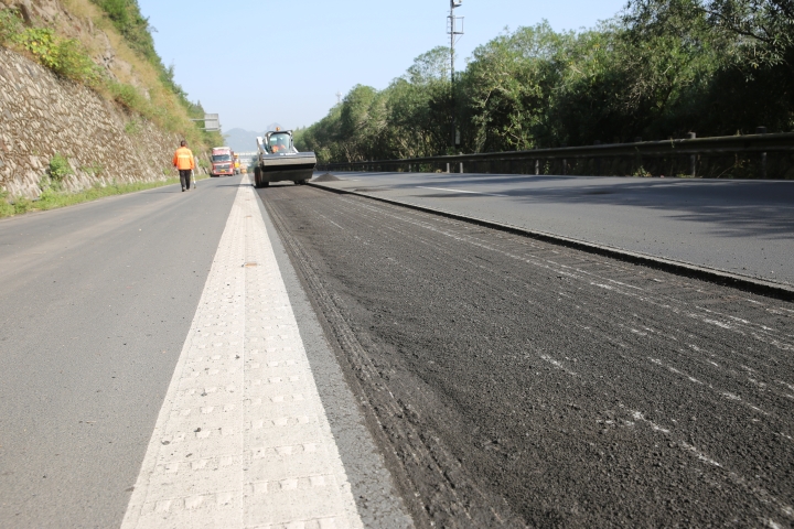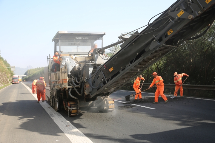 在黃土嶺北洞口附近的路面上,大型履帶式路面銑刨機銑削開一條寬度為2000mm的路面,散料隨之被迅速輸送到工程運輸車上,路面銑刨工作流程有條不紊展開。