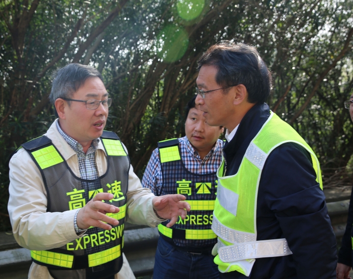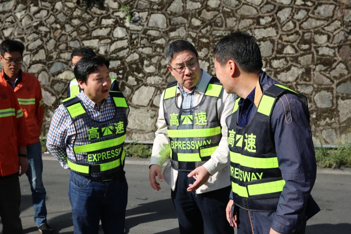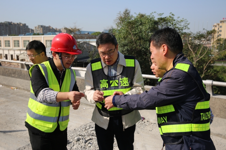 10月31日上午,臺州高速集團董事長陳文波在總工程師江輝的陪同下,趕赴甬臺溫高速公路溫州方向黃土嶺隧道、橋梁維修加固工程施工現(xiàn)場,檢查施工進展情況。