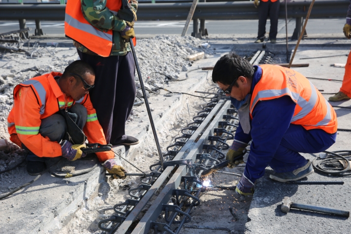 隨后,在伸縮縫型鋼安裝現(xiàn)場,陳文波撿起鑿除的碎渣,查看被鑿除的舊伸縮縫情況。公司所轄路段屬于軟土路基,且有91座橋梁,由于運行時間已20余年,部分橋梁伸縮縫破損較為嚴重,如何維修橋梁伸縮縫和橋頭跳一直是個老大難問題。在橋梁伸縮縫修補現(xiàn)場,因為重車的碾壓,部分伸縮縫已經(jīng)磨損嚴重,所在的混凝土路面只能借助鑿巖機進行作業(yè)。
