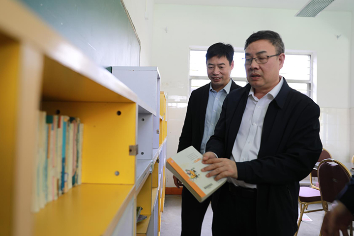 圖為陳文波和陳保衛(wèi)參觀學(xué)校閱讀室