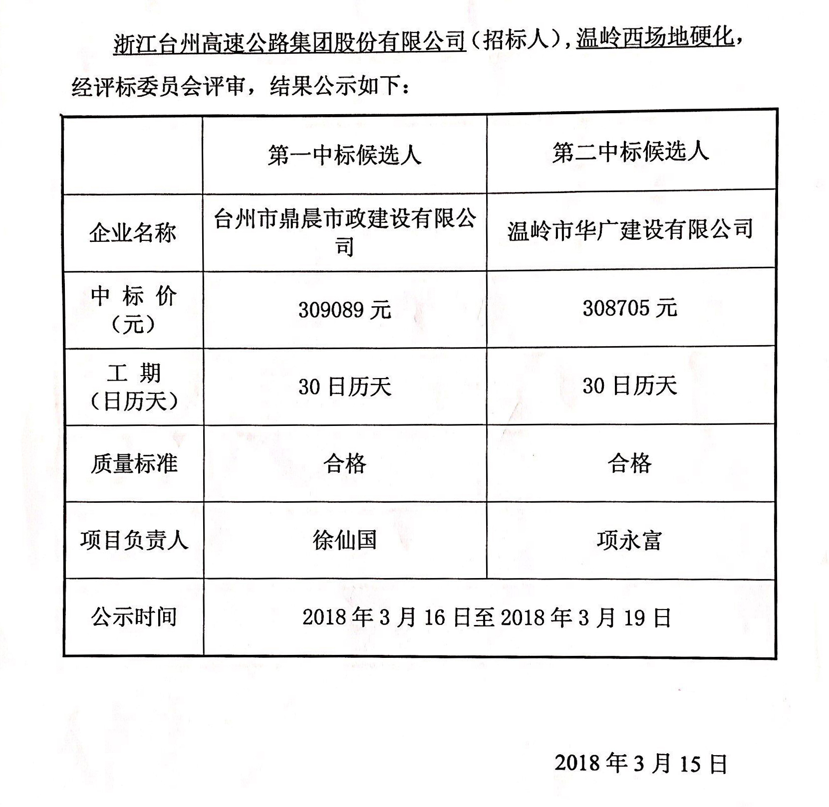 溫嶺西場地硬化工程中標(biāo)候選人公示單
