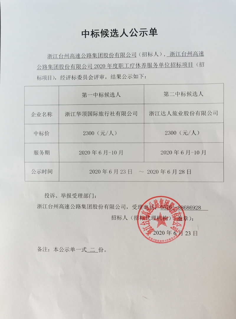 2020年度職工療休養(yǎng)服務(wù)單位招標(biāo)項目中標(biāo)候選人公示單