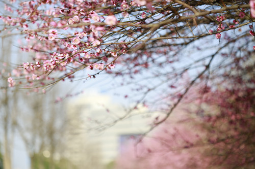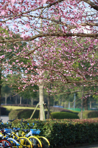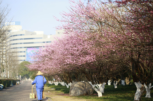 最后一站,便是市民廣場(chǎng),我見過(guò)的最美公交站臺(tái)。初春的清晨啊,一下車便有沁香拂散,迎接我下車的那是大片繁花盛開呀,路邊草地一溜的紅梅、白梅,在藍(lán)天下絢爛地肆無(wú)忌憚地綻放。呵,是的,還有藍(lán)天,最近流行的一個(gè)詞叫“臺(tái)州藍(lán)”,忽然想起來(lái),每日公交車上下班,低碳出行,這算是我為“臺(tái)州藍(lán)”添了一筆淡藍(lán)嗎?應(yīng)該是吧。于是,在藍(lán)天紅白花海中,慢慢穿過(guò)梅林、小橋、亭子,上班之路竟是如此心情舒緩。 鄭蔚